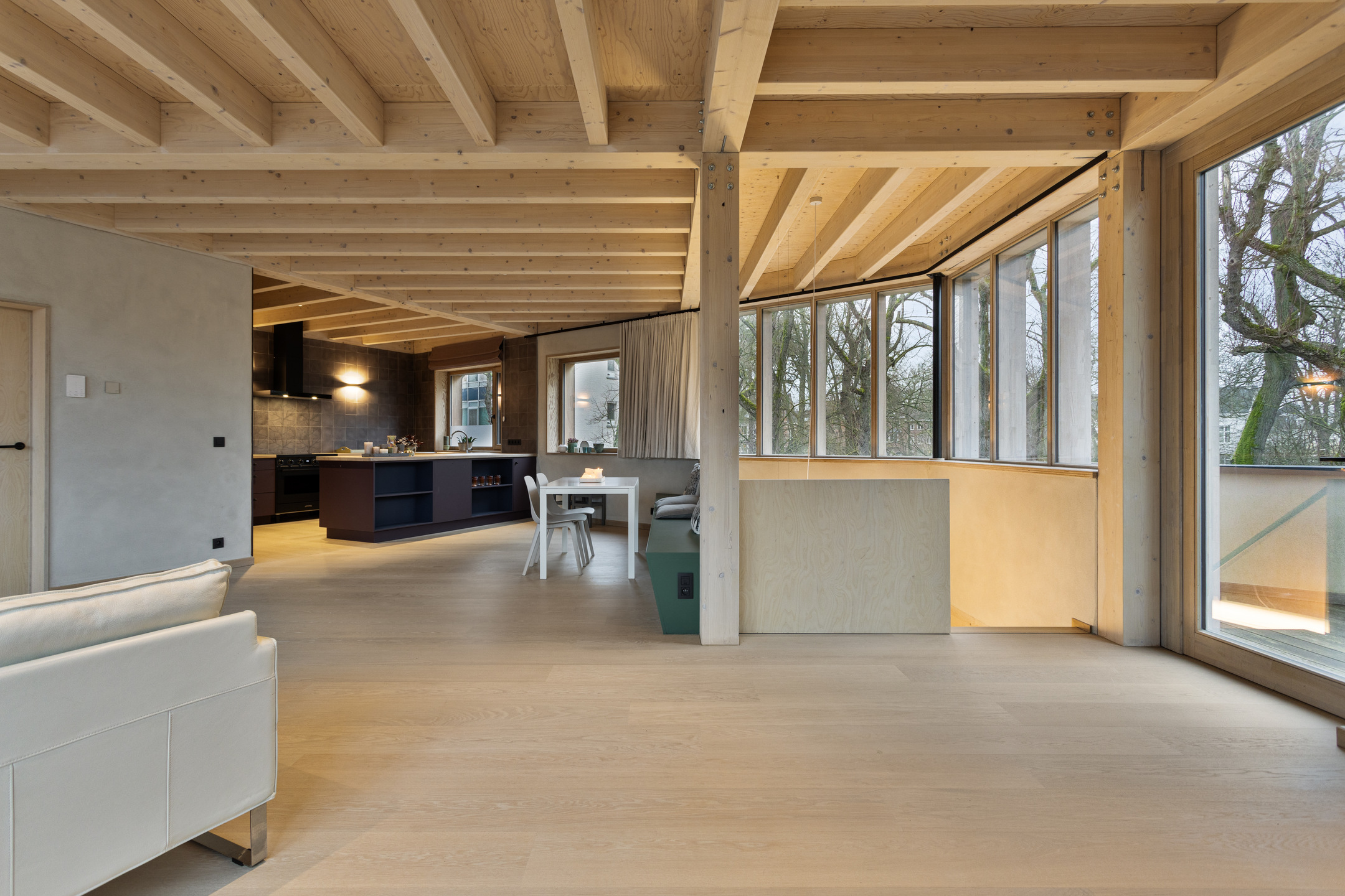 Tweede verdieping: leefruimte, open keuken, polyvalente kamer, berging en toiletruimte, privé terras