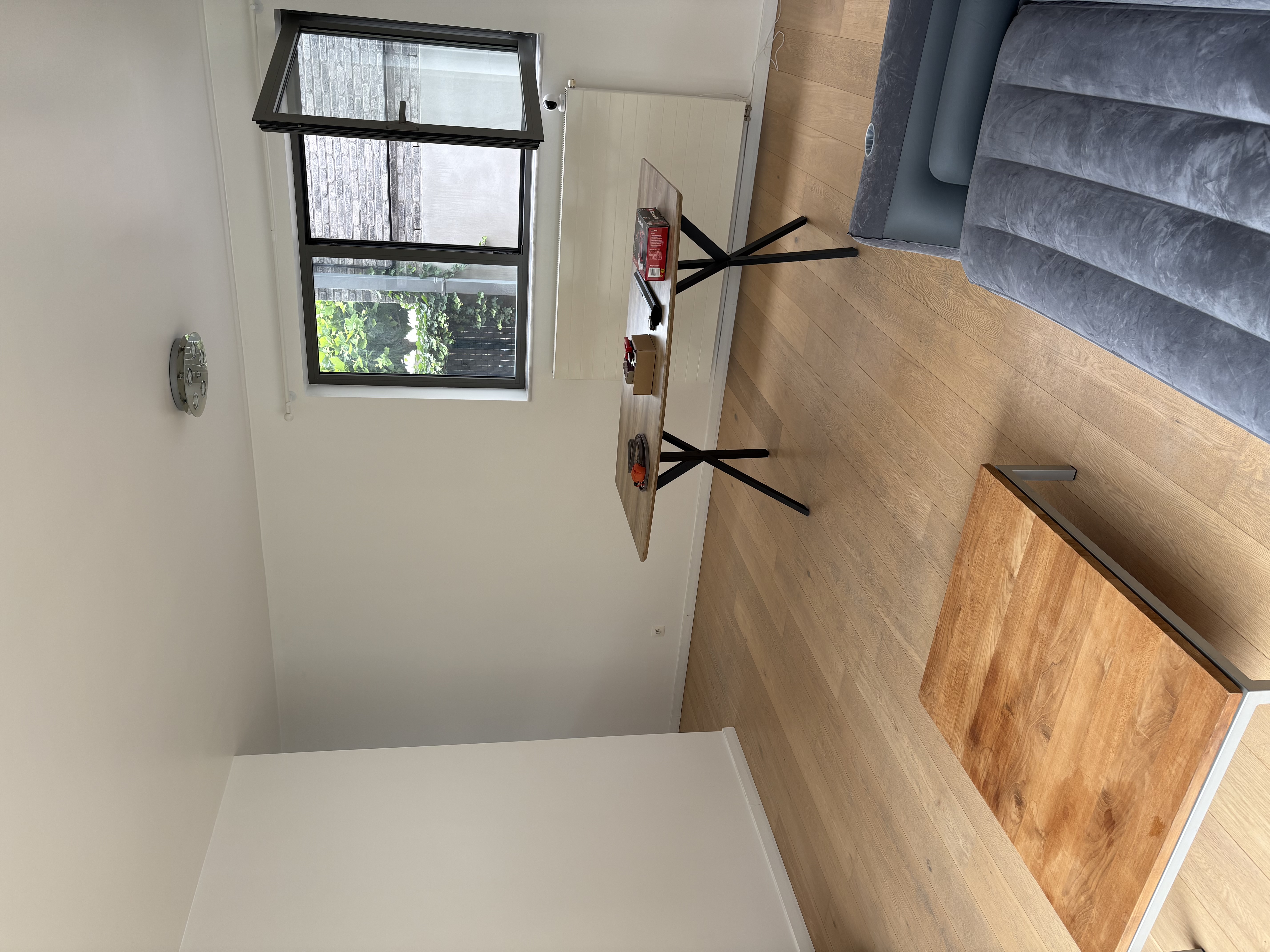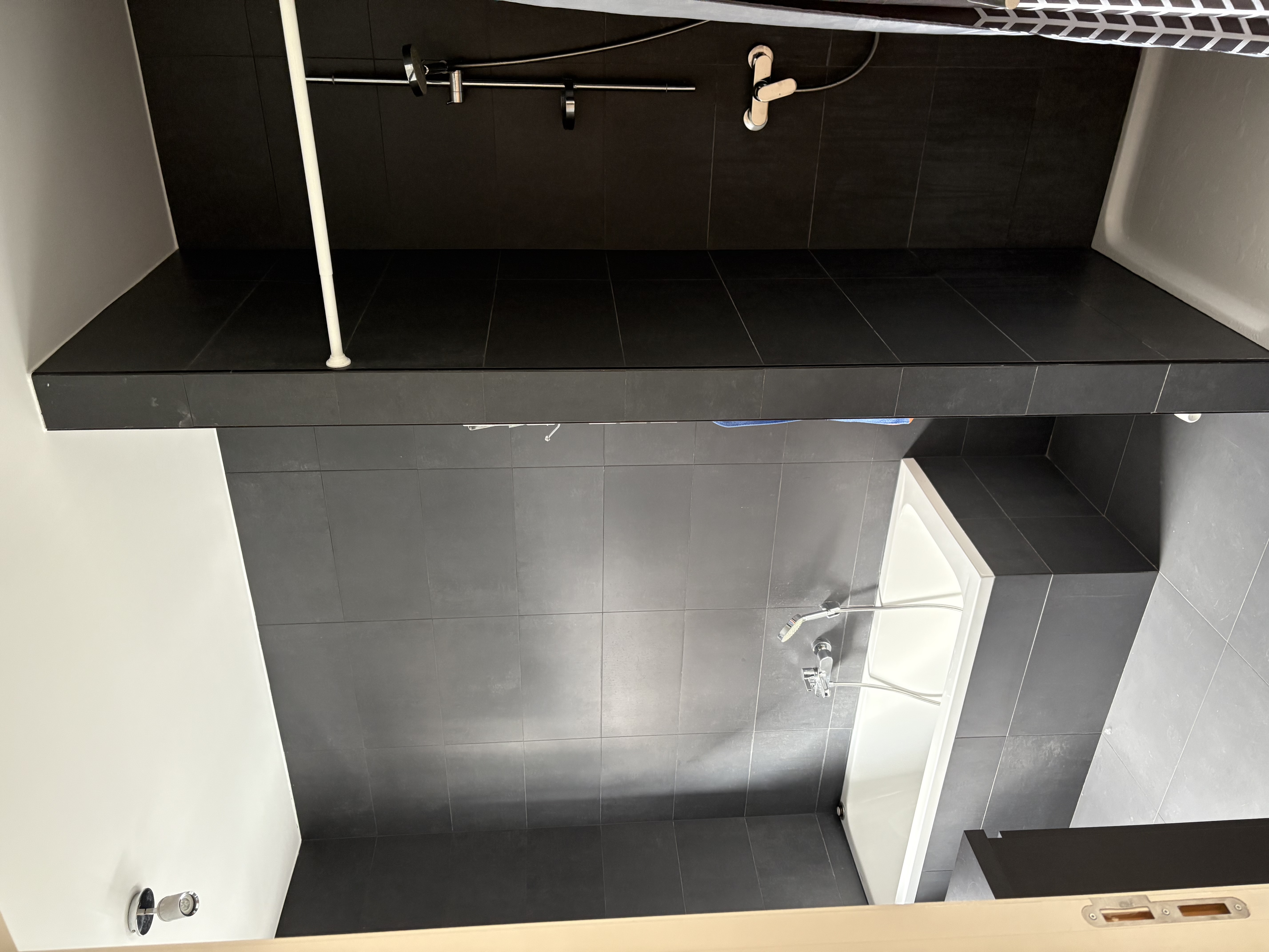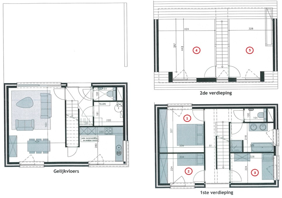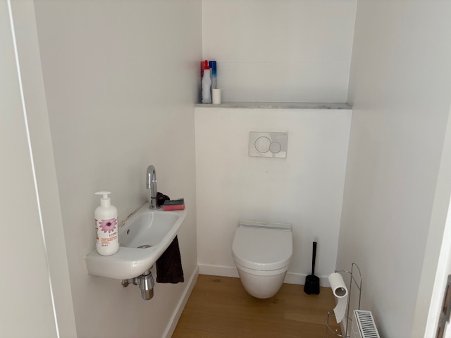 Nieuwe woning voor 5 samenhuizers, 5 aparte slaapkamers waarvan 1 met eigen sanitair (douche en toilet), andere 4 delen badkamer en twee toiletten.